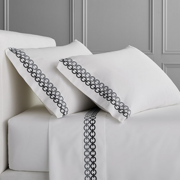 Un eslabón de la cadena gráfica de nuestro diseño hace una declaración limpia y elegante en la cama. Esta ropa de cama extremadamente suave se vislumbra en Perú de algodón pima de fibra extra larga con acabados delicados bordados.